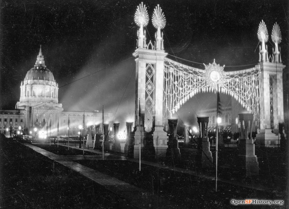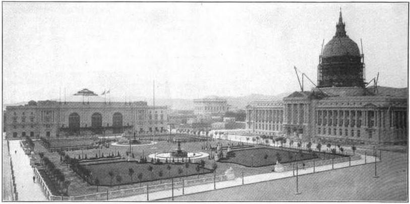 According to the San Francisco Recreation & Parks Department, the size of Civic Center Plaza ranges from 4.53 to 5.38 acres. It was originally commissioned after San Francisco for the 1915 Panama–Pacific International Exposition. The plaza was reconstructed starting in 1956 to build two underground structures: Brooks Hall and a parking garage and includes two play structures which opened in 1999.